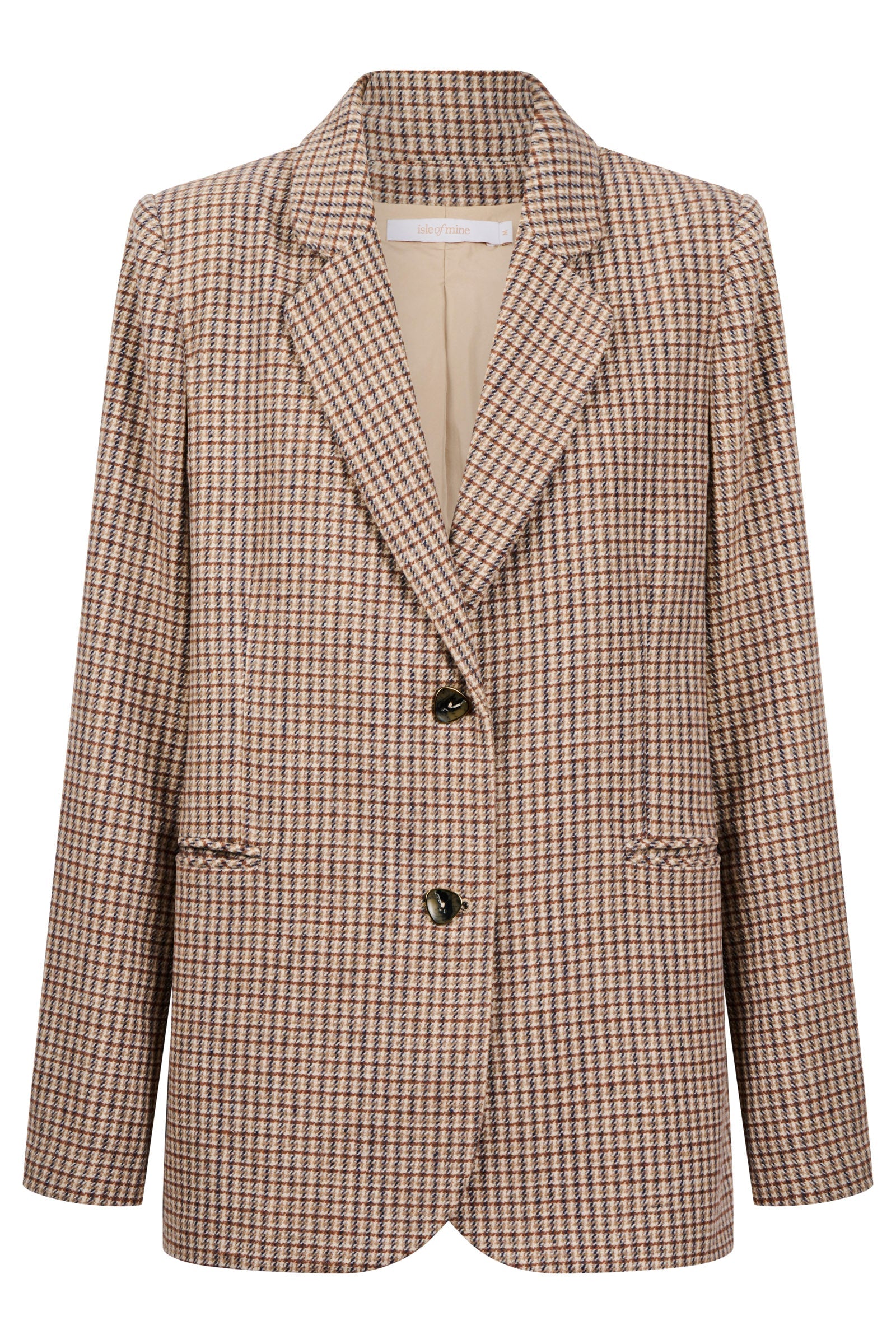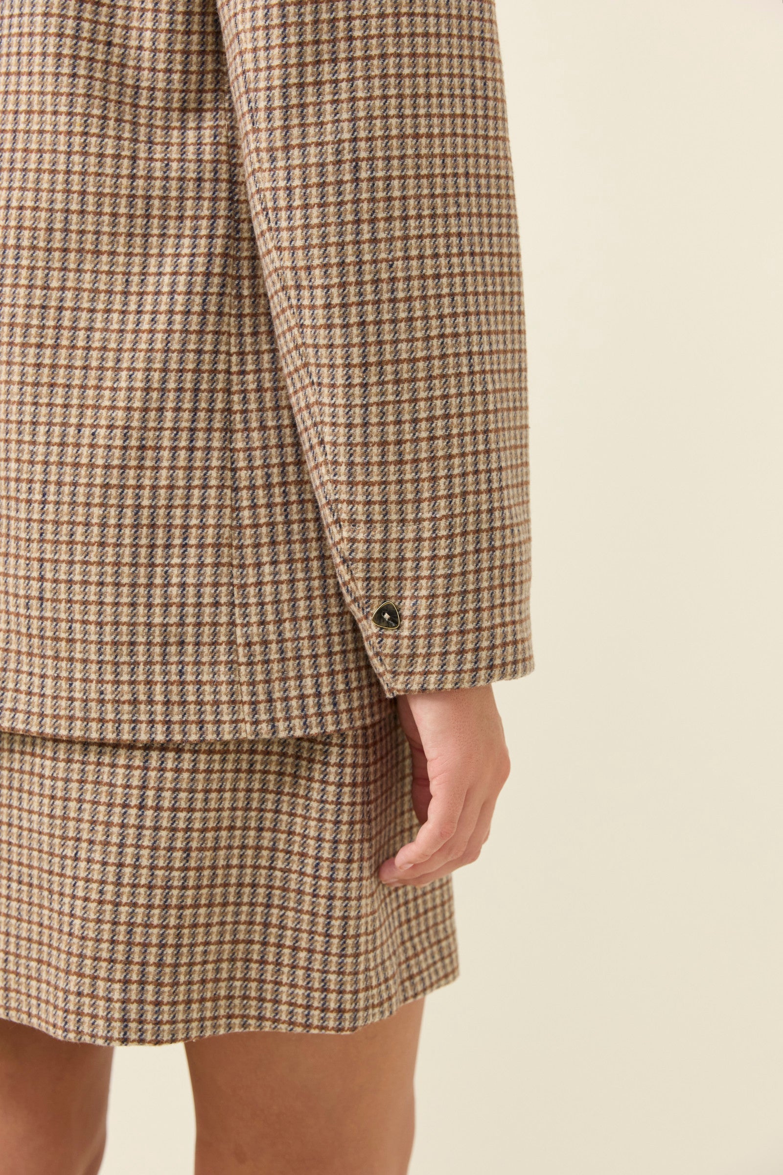 A classic houndstooth blazer cut in soft suiting fabric and fully lined for comfort. The notched lapel, diamond-shaped buttons and welt pockets bring a timeless tailored feel, while subtle shoulder padding adds light structure.