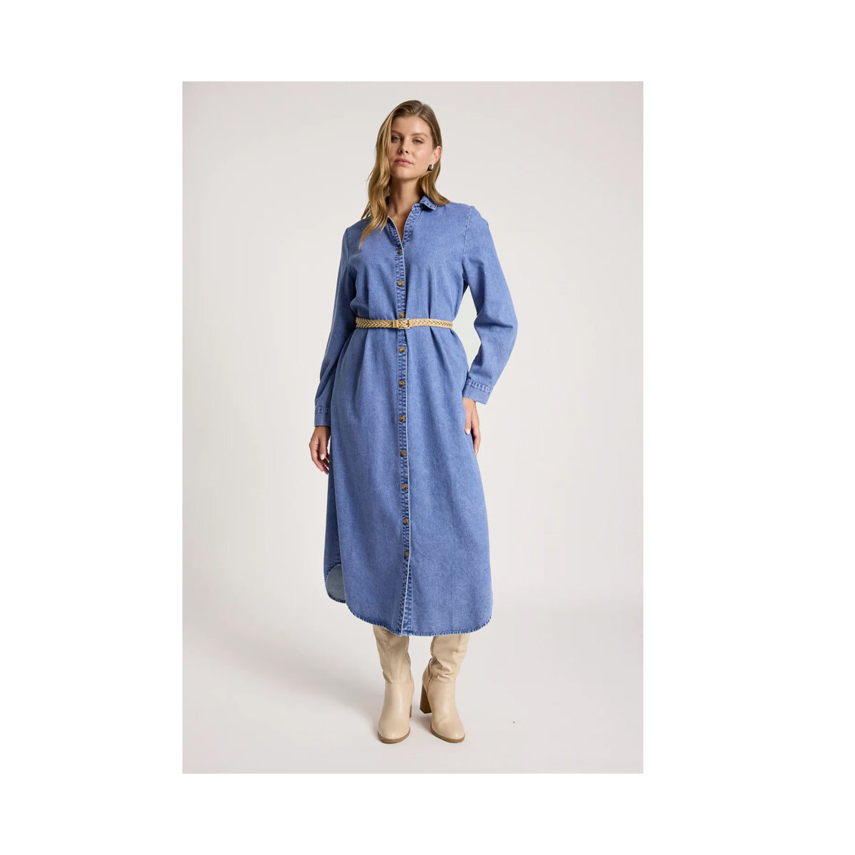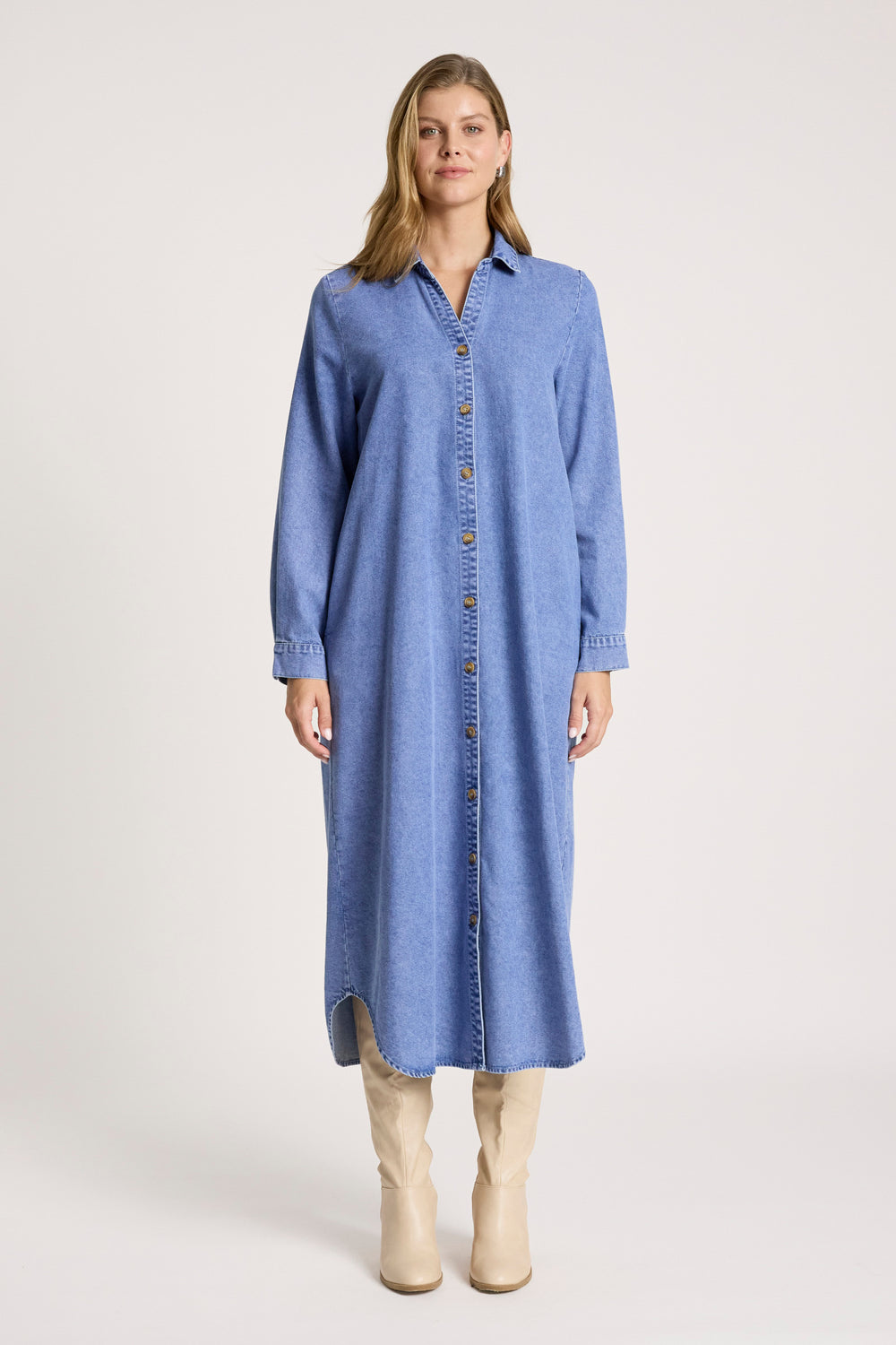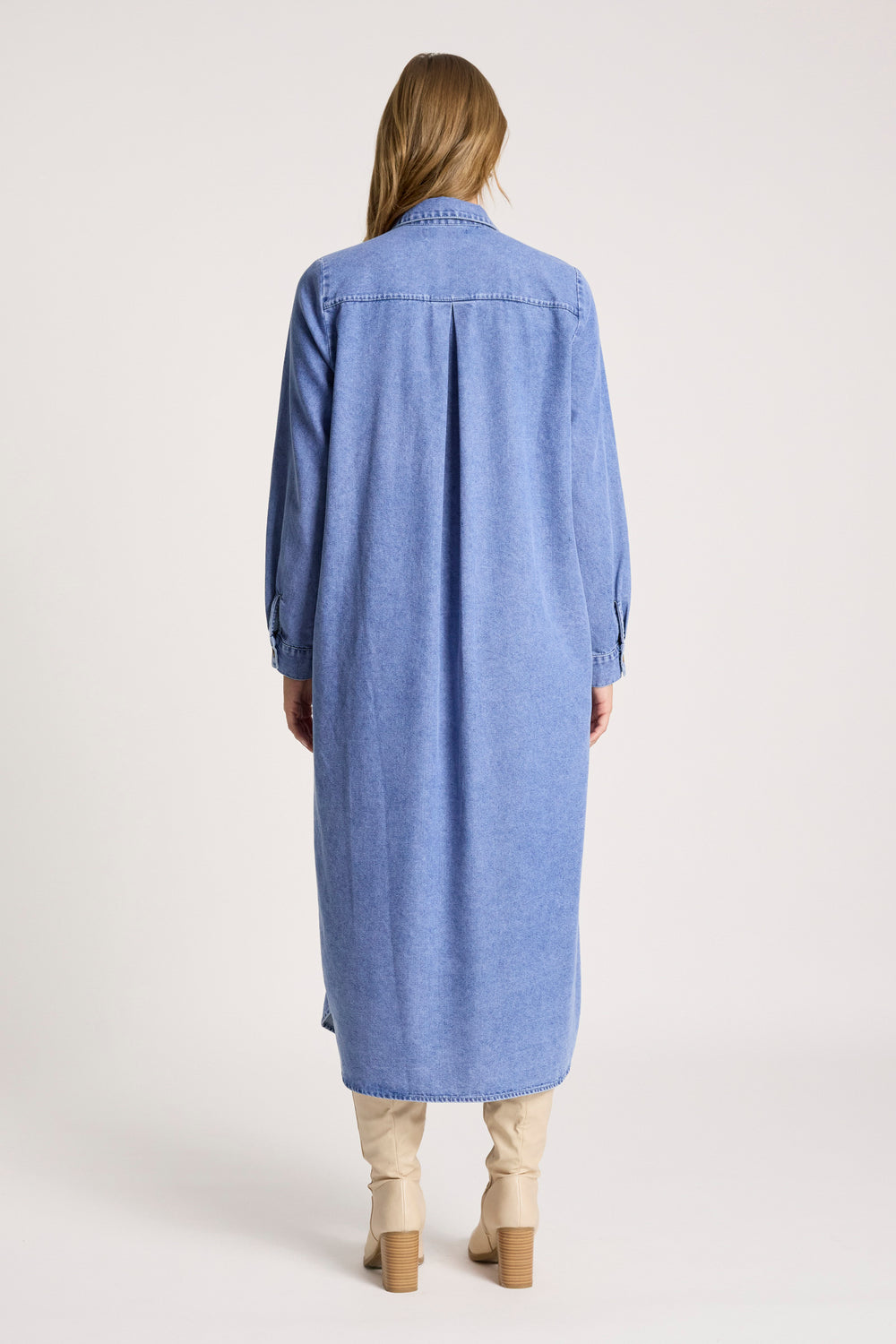 A relaxed shirt-style denim dress crafted from soft, acid-wash chambray. Featuring a classic collar, dropped open neckline and functional button front, it can be worn as a dress or styled open as a layering piece. Finished with pockets for everyday ease.