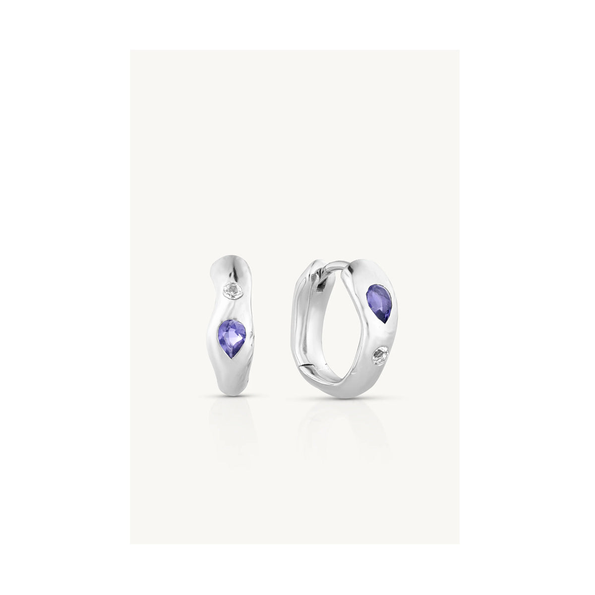 Each organically shaped, hammered hoop cradles a pear-cut Iolite and a round White Topaz, set seamlessly into the design. One hoop begins with the pear, the other with the round, making them feel like kindred spirits.