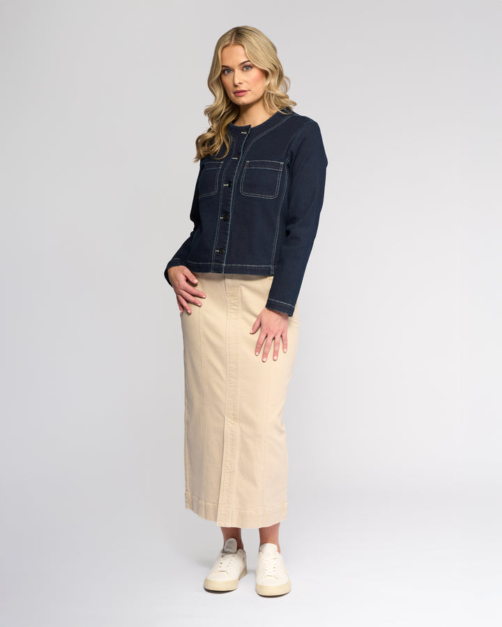 Relaxed-fit denim jacket in Ink Denim - a deep dark blue with crisp white contrast topstitching. Designed without a collar for a clean, modern feel, this button-through style features front patch pockets and offers a contemporary update on a classic denim jacket.