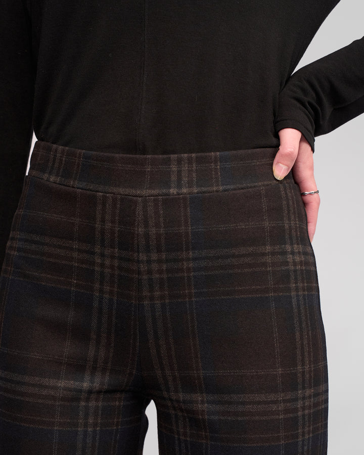 Full-length wide-leg pant in stretch ponti, designed in our Hugo print - a dark navy base highlighted with a dark brown and oat check. This easy pull-on style offers comfort and flexibility with its elasticated waistband, while the minimalist design and no-pocket finish keep the silhouette clean and modern.