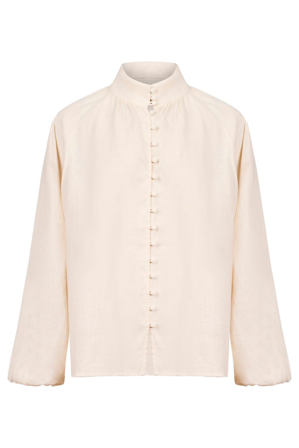 A refined linen shirt crafted from soft-washed 100% linen. Designed with a high neck collar, rouleau loop closures with self-covered buttons, and elasticated shirred cuffs that add a gentle blouson effect. Clean, minimal and versatile, it offers an elevated take on an everyday silhouette.