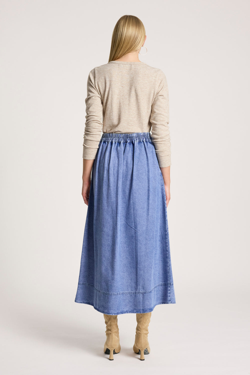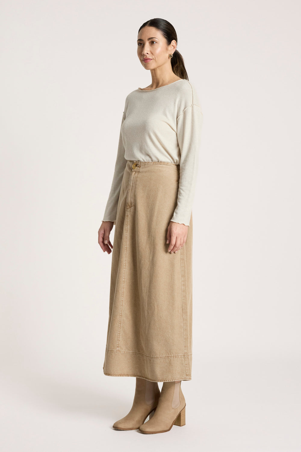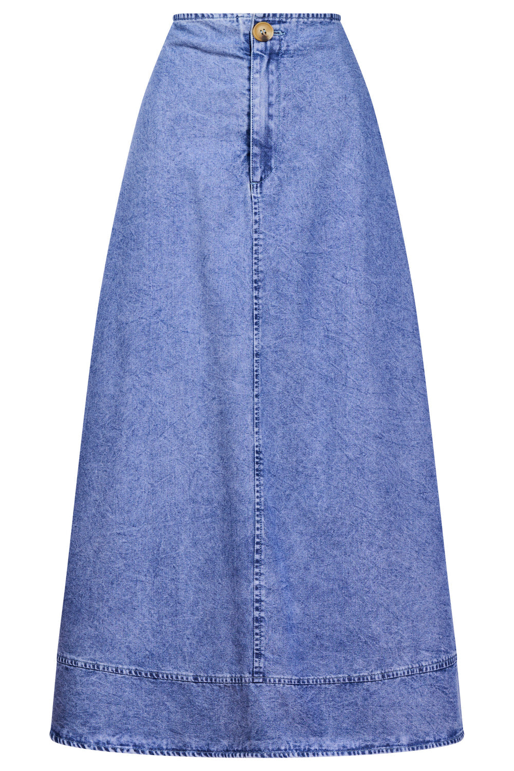 An on-trend A-line denim skirt designed for all-day comfort. Featuring a flat front waistband with button closure and an elasticated back for ease of wear, this style balances structure with flexibility. Finished with topstitch hem detailing and side pockets for practicality.
