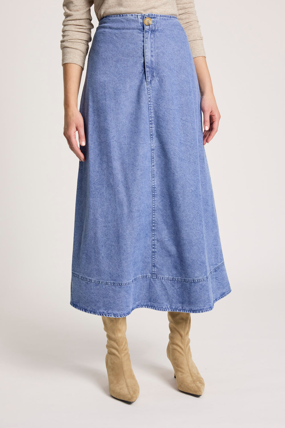 - A-line denim skirt silhouette