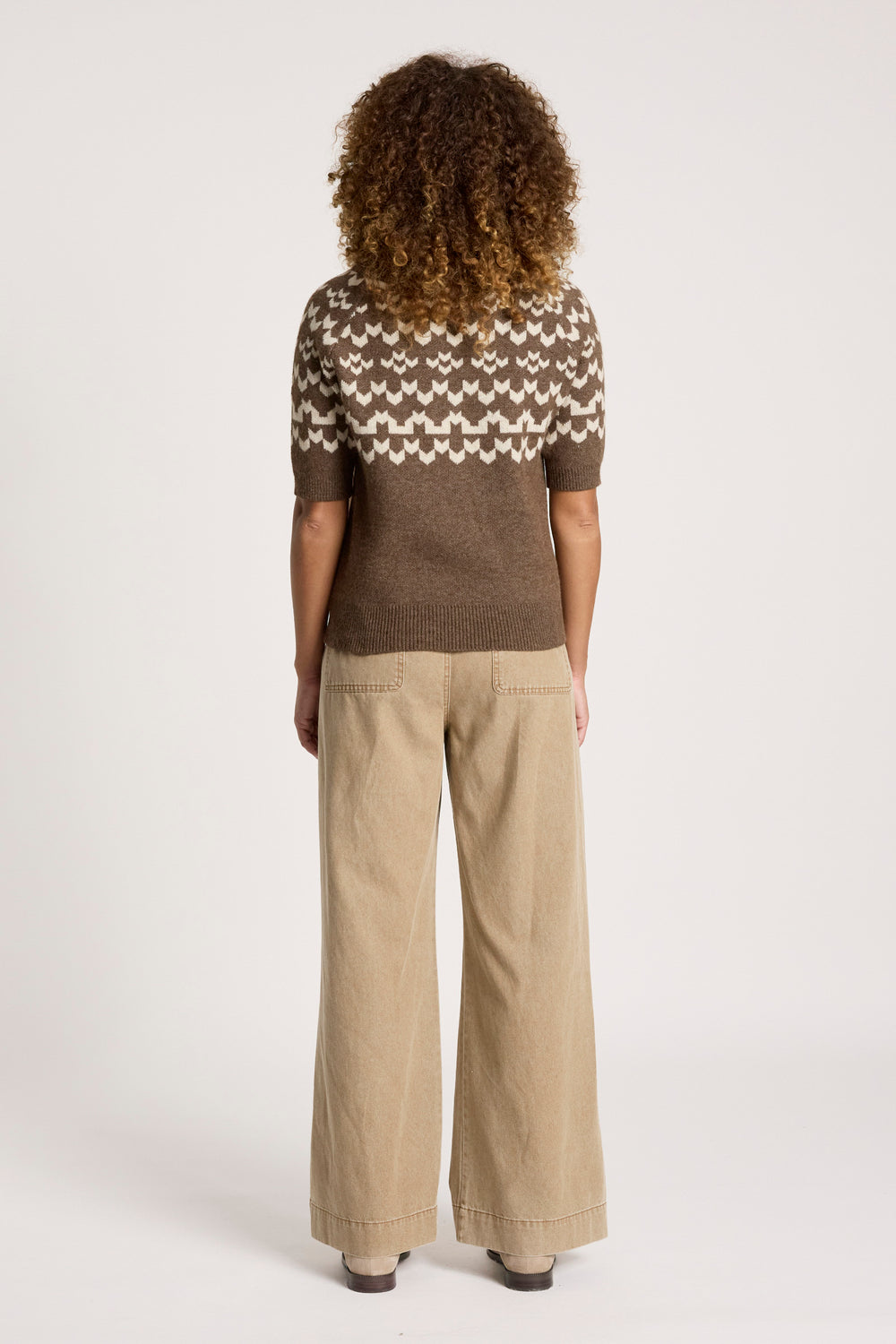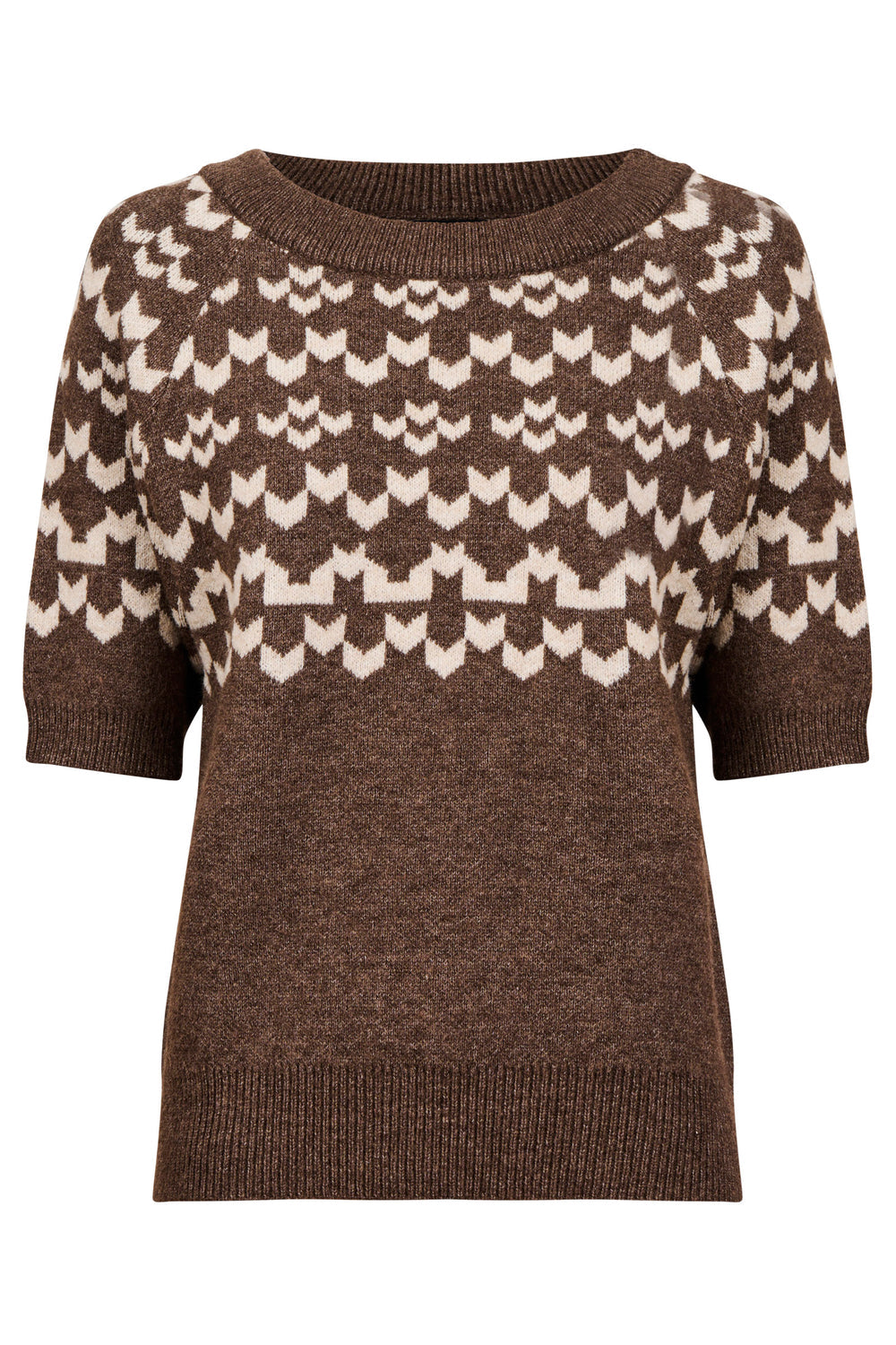 A modern take on a Fair Isle-inspired knit. The Maasai Knit Top features a two-tone patterned design with a thick ribbed, relaxed round neckline and short sleeves. Warm, textured and easy to wear, it brings subtle statement to everyday winter outfits.