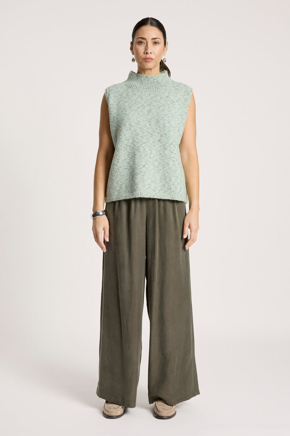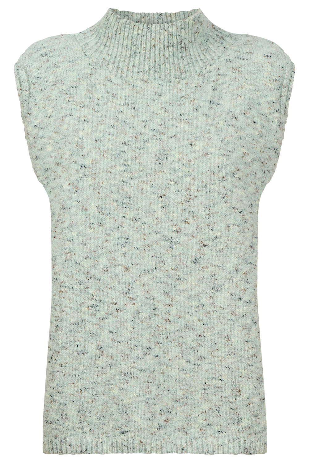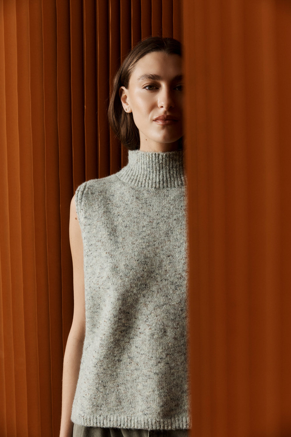A best-selling knit vest designed for warmth and easy layering. Crafted from a wool-blend with variegated yarn for subtle colour variation, this style features a high ribbed collar and sleeveless silhouette. Textured, cosy and endlessly wearable.